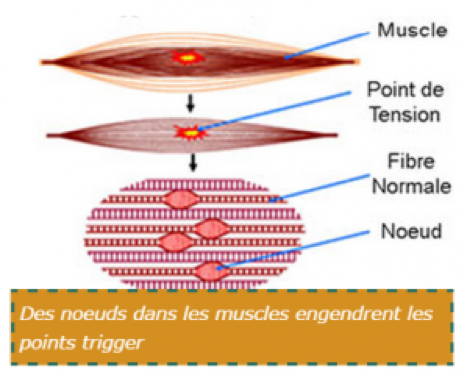Ainsi quand le myofascia (myo = muscle, fascia = enveloppe) change de consistance et devient de plus en plus épais, les déchets s’accumulent et les muscles reçoivent peu de nutriments et d’oxygène, il produit des nodules que l’on appelle des Points Gâchettes et peuvent causer une multitude de symptômes.