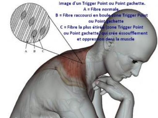mauvaise posture quotidienne. En effet, au travail, pendant des heures, le corps peut se retrouver dans une position inconfortable pour les muscles (position assise prolongée, gestes répétitifs...). Cette sollicitation passive, qui se prolonge, finit par favoriser l’apparition de points gâchettes de type passif. Les muscles apprennent à éviter les mouvements douloureux (comme une forme de protection).